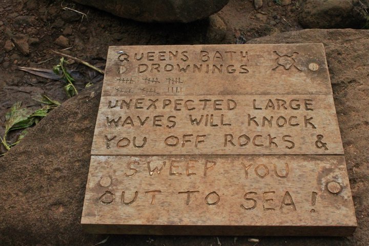 I met this girl Michelle while hiking the “Grand Canyon of the Pacific.” She’s from Portland and she’s also traveling alone. Now, we’re both staying in Princeville. We meet up to check out Queen’s Bath. We start what we expect to be a short walk along the black lava cliffs, but the tide’s coming in and the waves are crashing violently over the rocks. Evidently, they sweep people out to sea on a fairly regular basis, and to be quite frank, this prospect really starts to freak us the fuck out, so we turn back without meeting any sea turtles. It’s raining anyway, and I have plans to surf Hanalei with Cody’s dad, Mike, this evening.