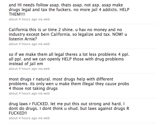 A tsunami advisory goes out for the entire Pacific Ocean.  On the East Coast of the United States, Facebook explodes with status updates.  At 9:56 a.m. Hawaii time, a surfer writes, “Sitting in Hawaii waiting for the END OF THE WORLD!”  At 2:57 p.m. Eastern time, a surfer in New York City reads it.  Twenty-one minutes later, this pattern repeats.  Multiply this activity by x: Twitter is veritably vibrating.